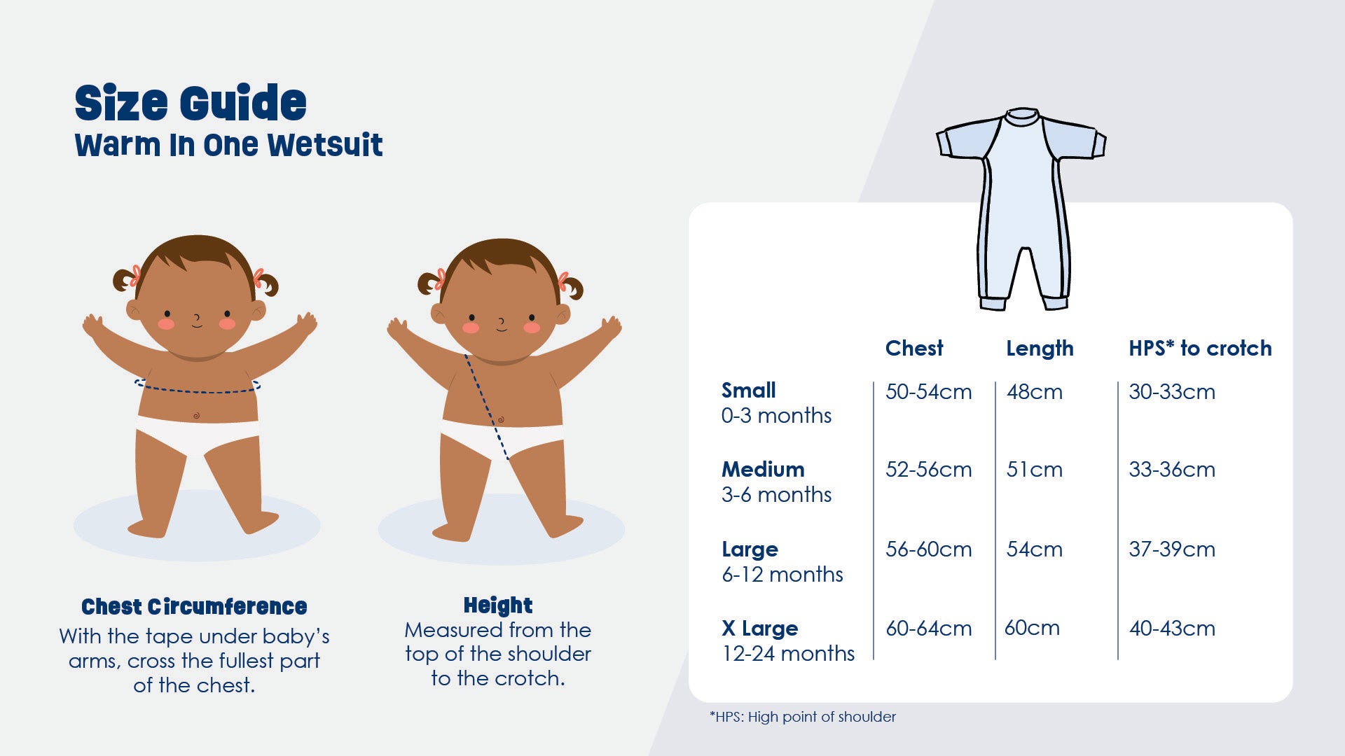 As with the Happy Nappy™ and Happy Nappy Duo™, do not measure baby when they have just had a feed. Measure the circumference of the tummy, across the belly button, and then the thigh, across the fullest part. Once those measurements have been obtained, you can measure the baby’s chest and height. The chest circumference should be taken with the tape under the baby’s arms, across the fullest part of the chest. Height should be measured from the top of the shoulder to the crotch.