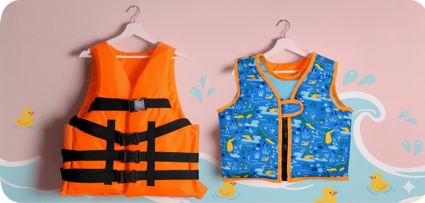Life Jacket keeps the wearer safe and face-up in the water, while a Swim Vest helps children learn to swim in a comfortable and supported way.