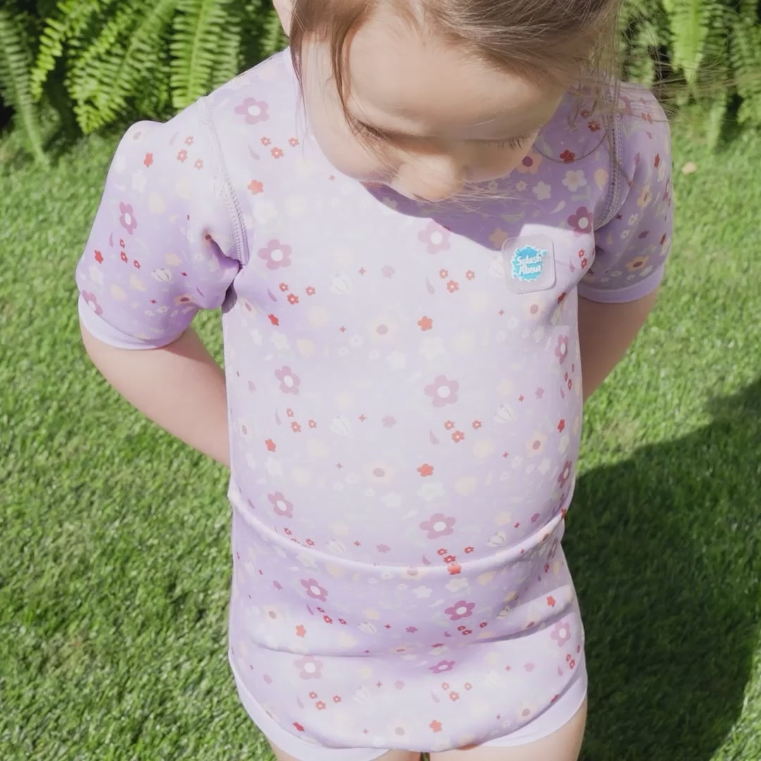 Spring flowers on a pastel backdrop make the Lilac Spring Happy Nappy™ Wetsuit a perfect choice for little girls. A pretty print to compliment a babies’ delicate features.