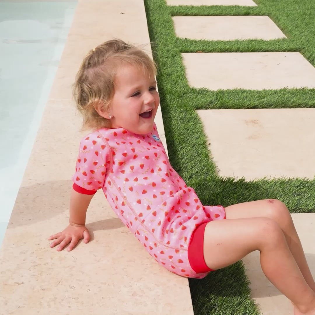 Covered with strawberries and delicate strawberry flowers, this vibrant Strawberry Field Happy Nappy™ Wetsuit is a delightful design for babies and toddlers.