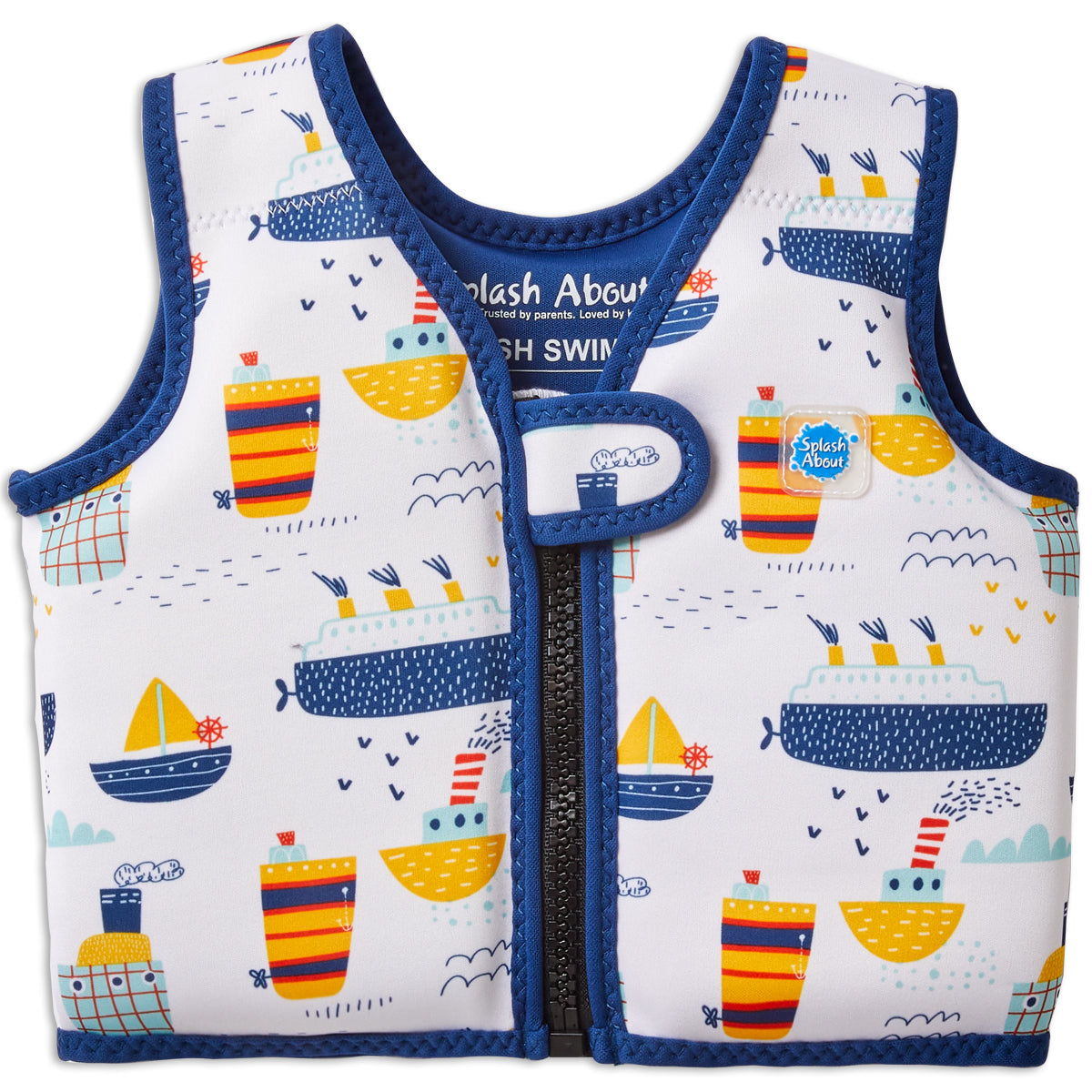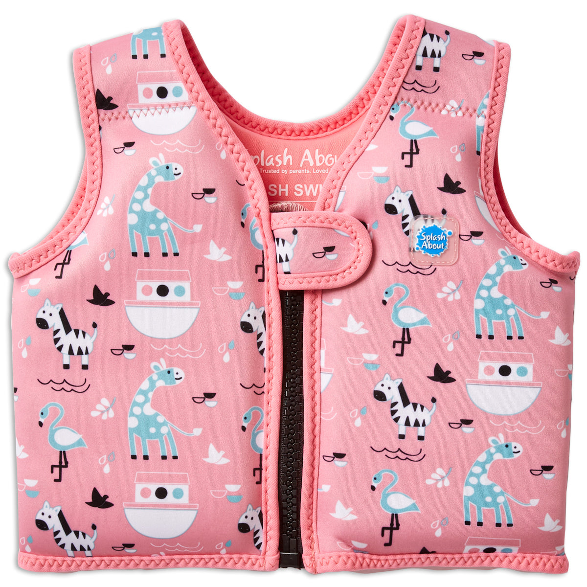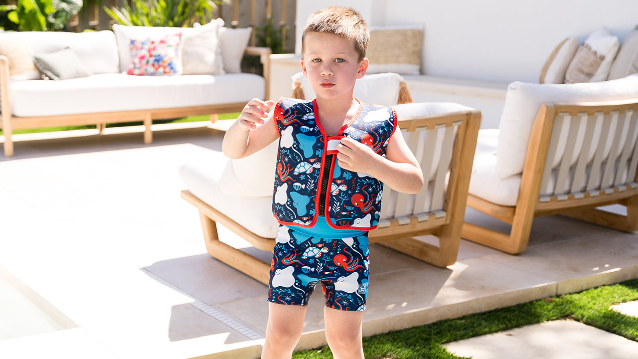 At Splash About, both the Float Jacket and the Swim Vest are designed as learn-to-swim aids. The key difference is that the Float Jacket has removable buoyancy, allowing you to gradually reduce support as your child gains confidence in the water. In contrast, the Swim Vest has non-removable flat floats, making it less bulky and easier to pack. This makes the Swim Vest a convenient option for travel, while the Float Jacket offers more flexibility in adjusting buoyancy levels.