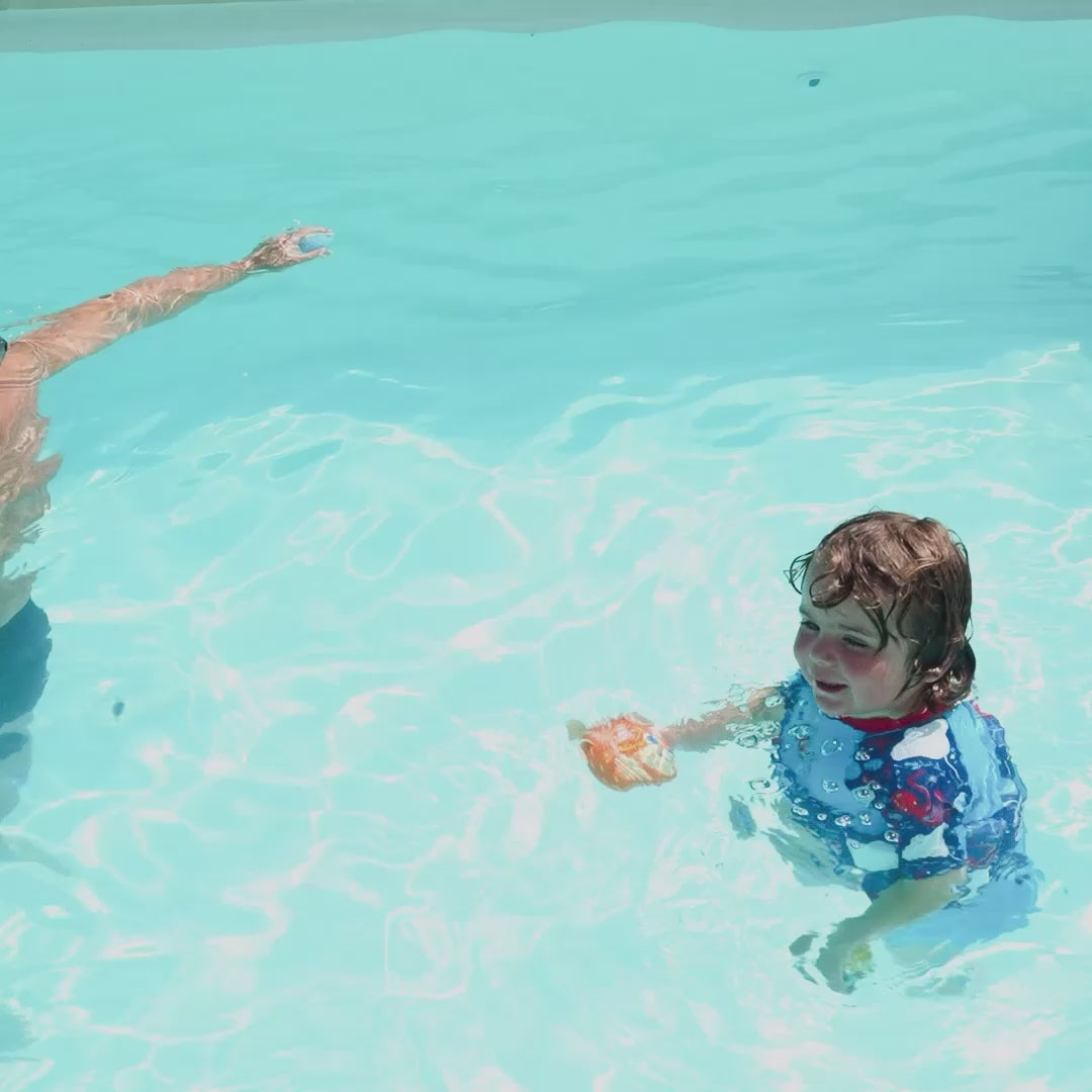 Please note, this is not a life-saving device and adult supervision is required at all times. You may need to hold the child’s hands on first wearing the Sleeved Floatsuit until they find their balance and stability in the water.