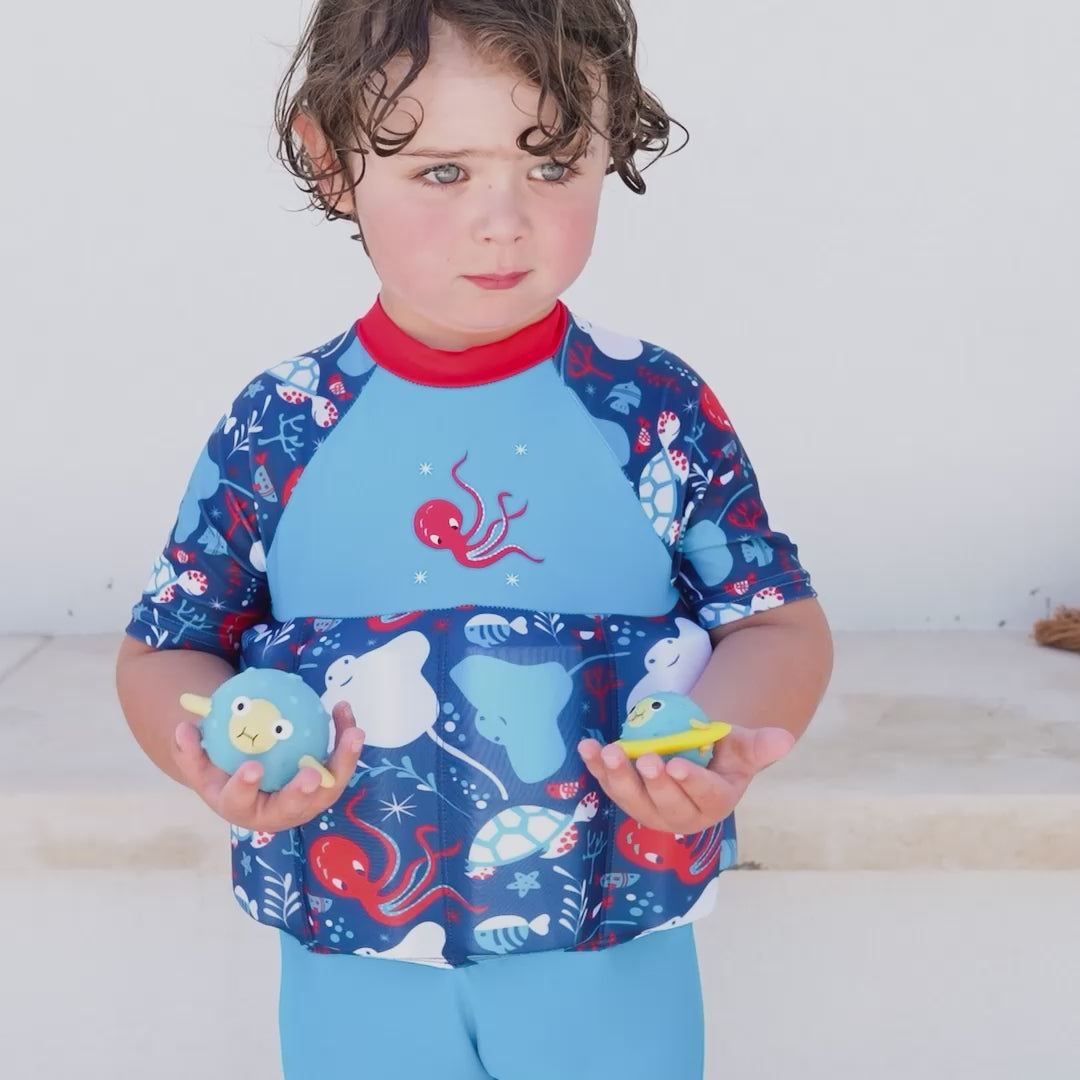 Dive in, in our Sea Life Sleeved Floatsuit. Featuring playful sea friends including turtles, rays and our shy octopus, this is a perfect design for little explorers.