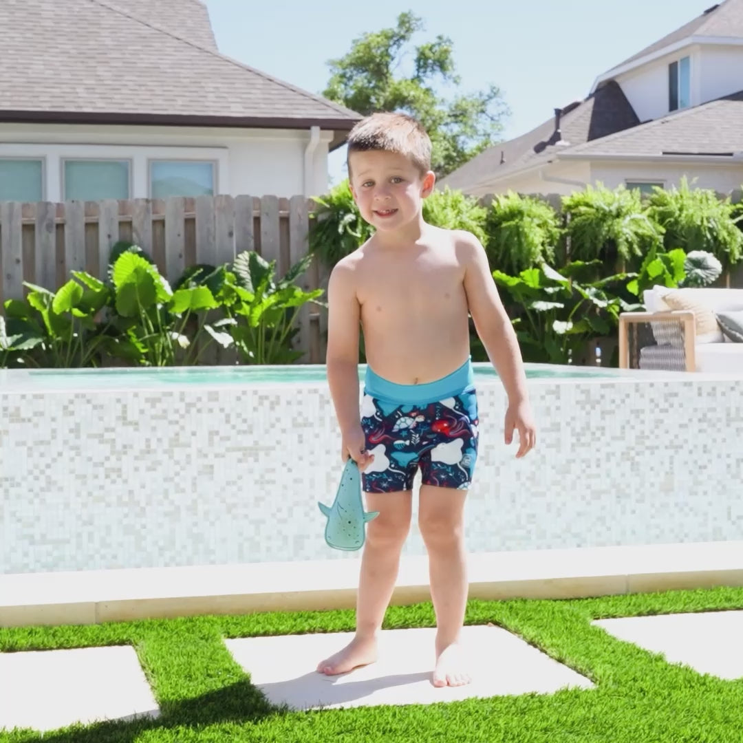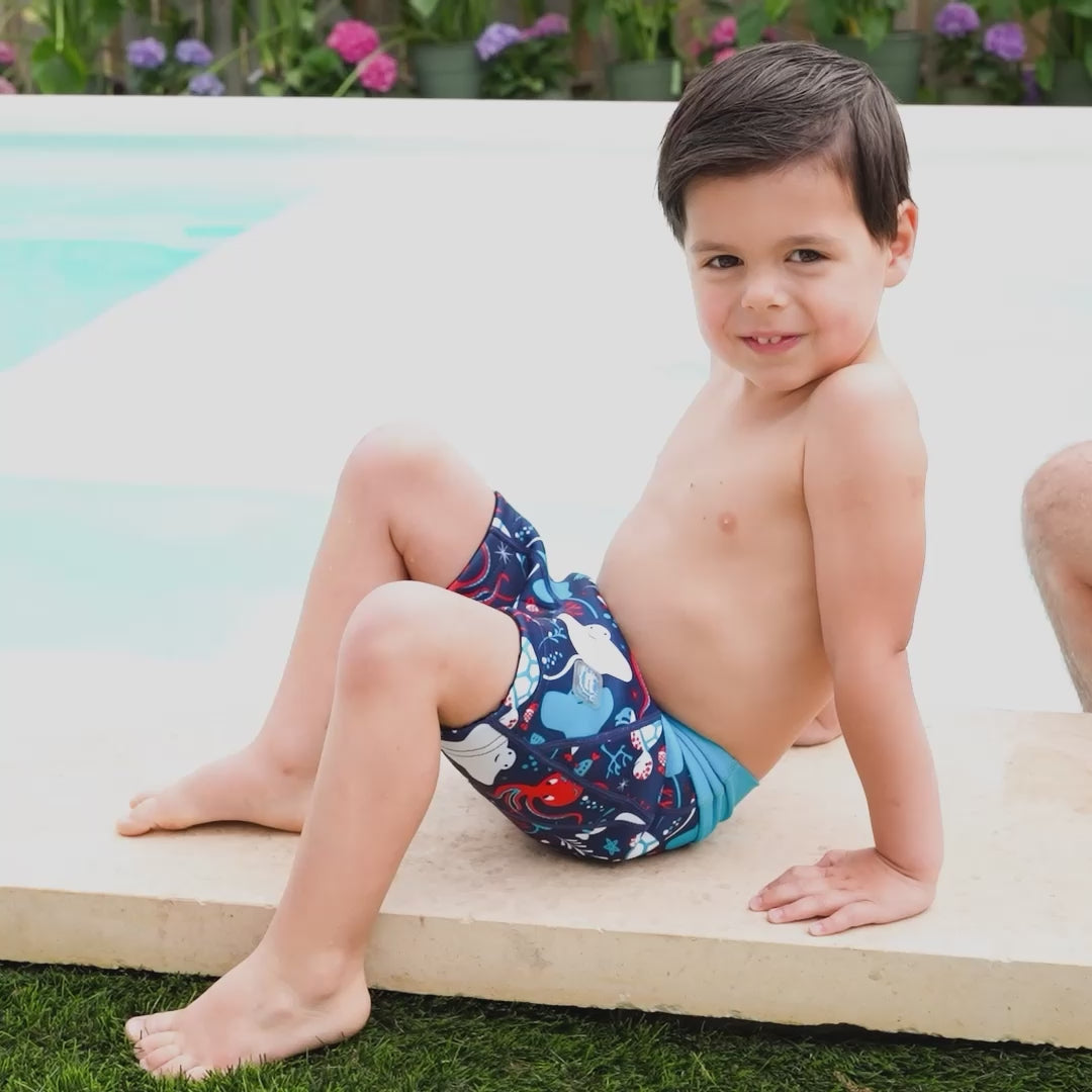 Dive into the water in our Under the Sea Splash Jammers. Featuring playful sea friends including Turtles, Rays and our shy octopus, these Jammers combine full solid leak protection with fun designs for your little adventurer.