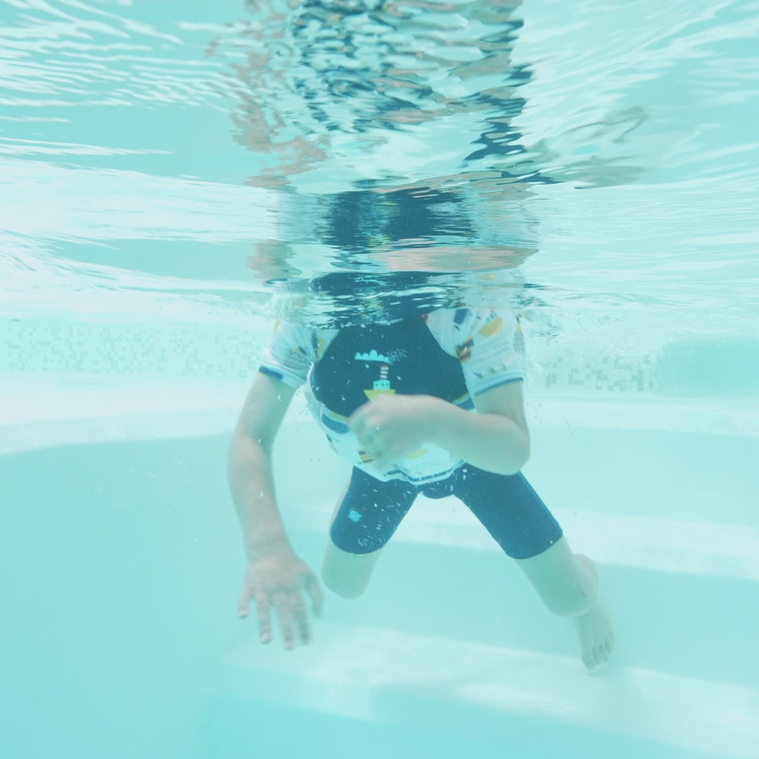 Please note, this is not a life-saving device and adult supervision is required at all times. You may need to hold the child’s hands on first wearing the Sleeved Floatsuit until they find their balance and stability in the water.